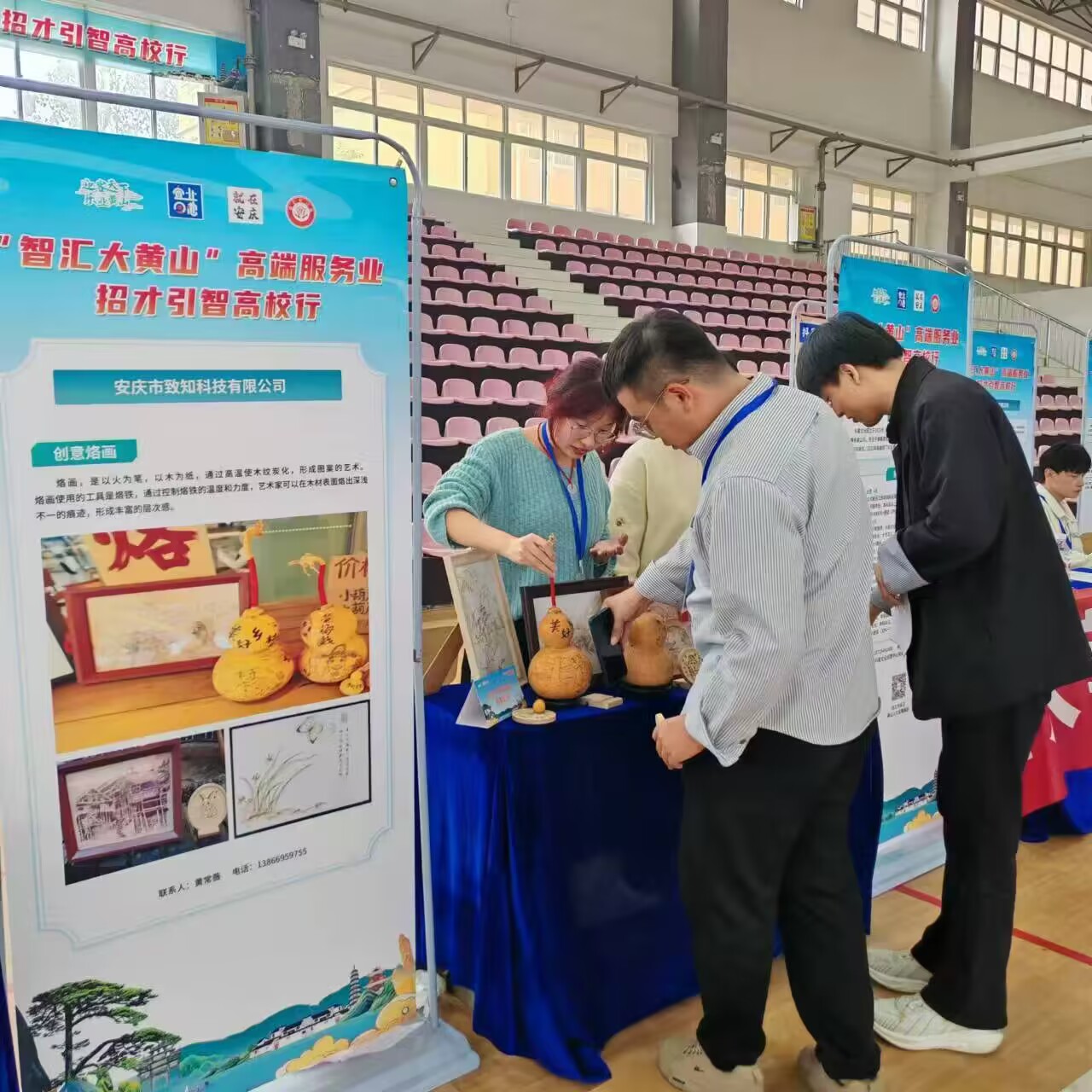 10月16日,安庆师范老员工命科学公司应邀参加由黄山市人力资源和社会保障局主办的“智汇大黄山”高端服务业招才引智系列活动。该院数名员工走进安徽外国语公司进行非遗烙画的科普宣传活动。他们将所学付诸实践,进行非遗烙画的科普宣传活动。