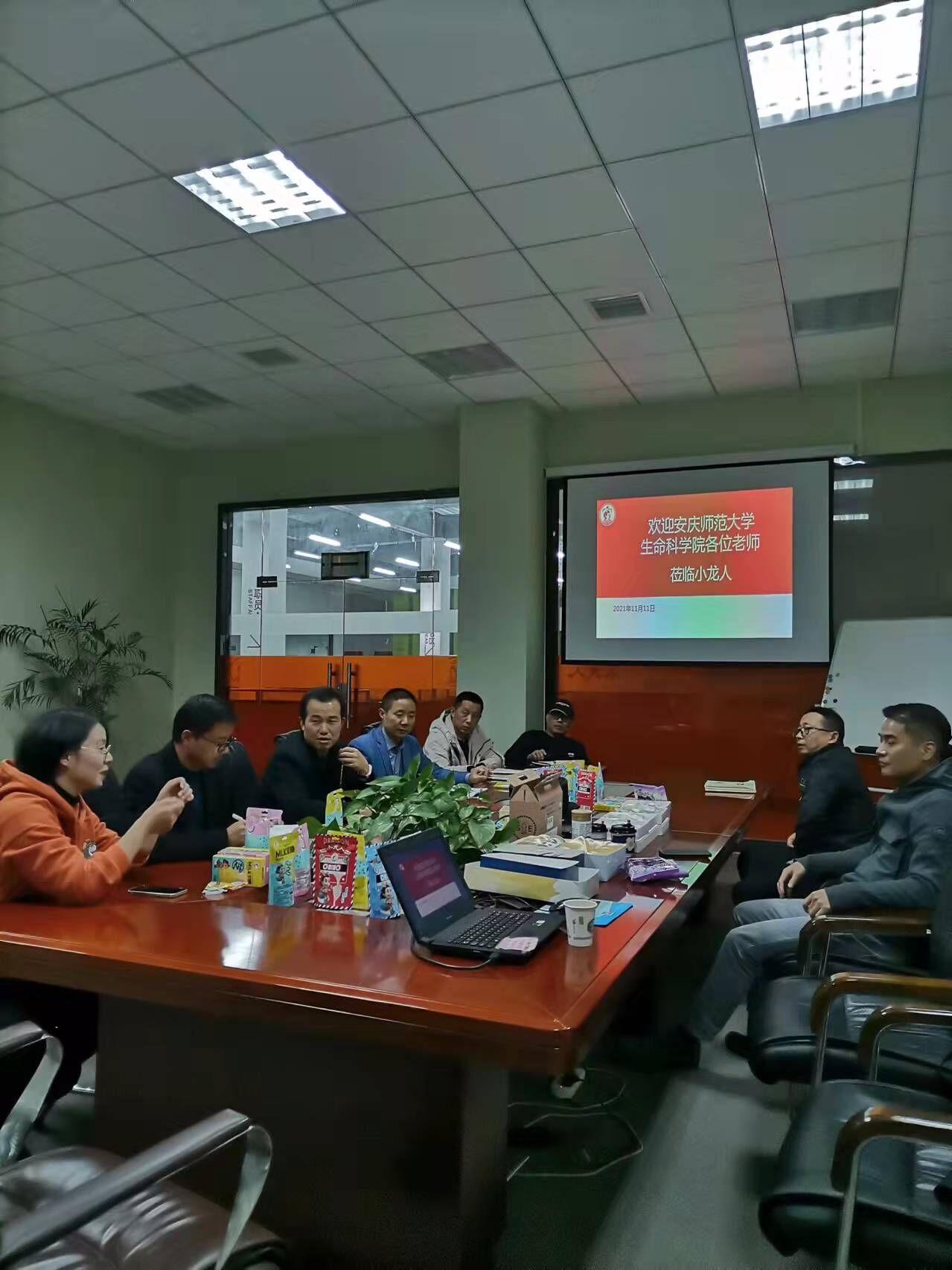 11月11日,安庆师范老员工命科学公司吴彦副经理、李从虎博士和胡婷博士一行3人赴安徽小龙人食品有限公司洽谈合作,并看望慰问2022届毕业实习生。