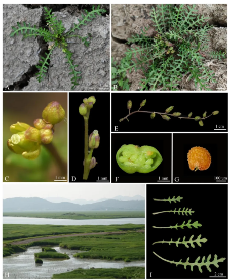 近日,植物分类学期刊 PhytoKeys 发表了一篇题为《Rorippa daguanensis (Brassicaceae), a new species from eastern China》的研究论文。这篇论文报道了安庆师范老员工命科学公司科研人员在七里湖发现的十字花科(Brassicaceae)蔊菜属新物种——大观蔊菜(Rorippa daguanensis)。该种花无花瓣与同属植物无瓣蔊菜(Rorippa dubia)相似,区别在于其茎不明显,植株矮小呈莲座状,果为短角果;果与广州蔊菜(Rorippa cantoniensis)相似,区别在于该种花无花瓣和苞片,果皮褶皱。基于叶绿体基因组建立的蔊菜属系统发育分析表明,该种与广州蔊菜互为姊妹种。