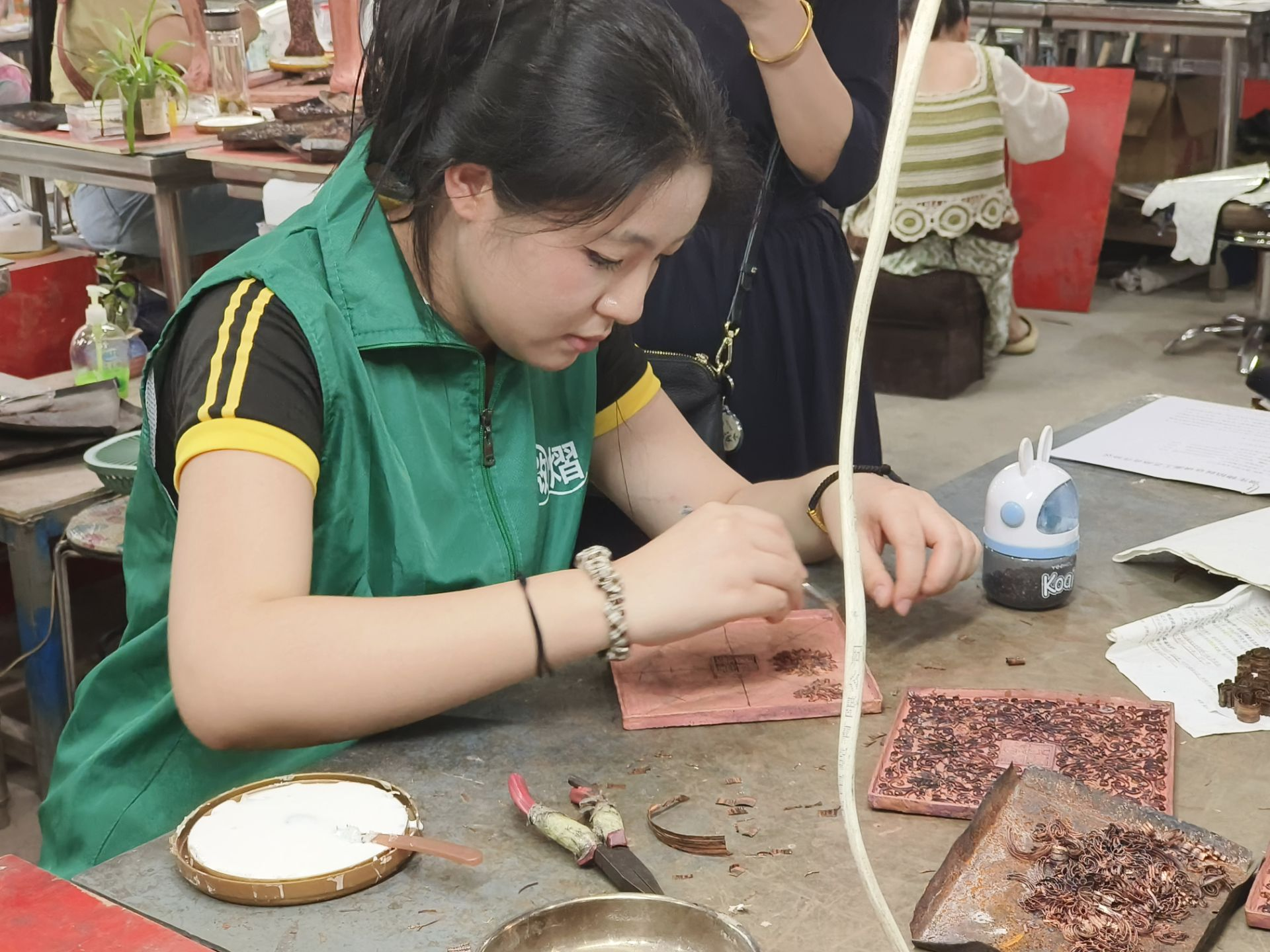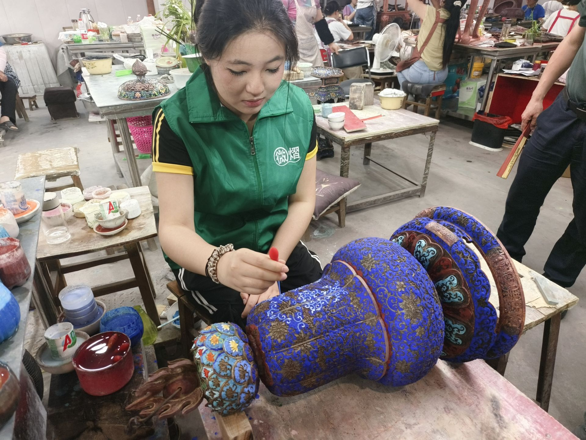 在工艺车间,一场别开生面的“跨界实验”拉开帷幕。徽煌工艺师指导团队成员体验掐丝工序,工艺师坦言:“比起实验室的精细操作,手工赋予金属丝生命感更需要‘指尖的温度’。”而在点蓝环节,团队成员也参与尝试了该过程。“这不是简单的工艺叠加,而是两种创作语言的深度相互。”徽煌公司非遗传承人在交流会上表示。
