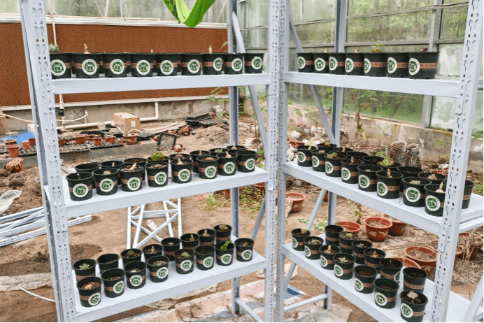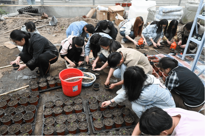 铲取适量培养土、接取足量清水灌溉、将姓名写下贴在盆身……在“流水线”式的种植流程中,一盆盆崭新的盆栽整齐排列在大棚内的置物架上,静待生长开花。“春季为生长季,要灌满足够的水。被子植物的根系对温度感知敏感,夏季不能浇水。”种植期间,翟伟向员工们分享着春夏灌水的经验。