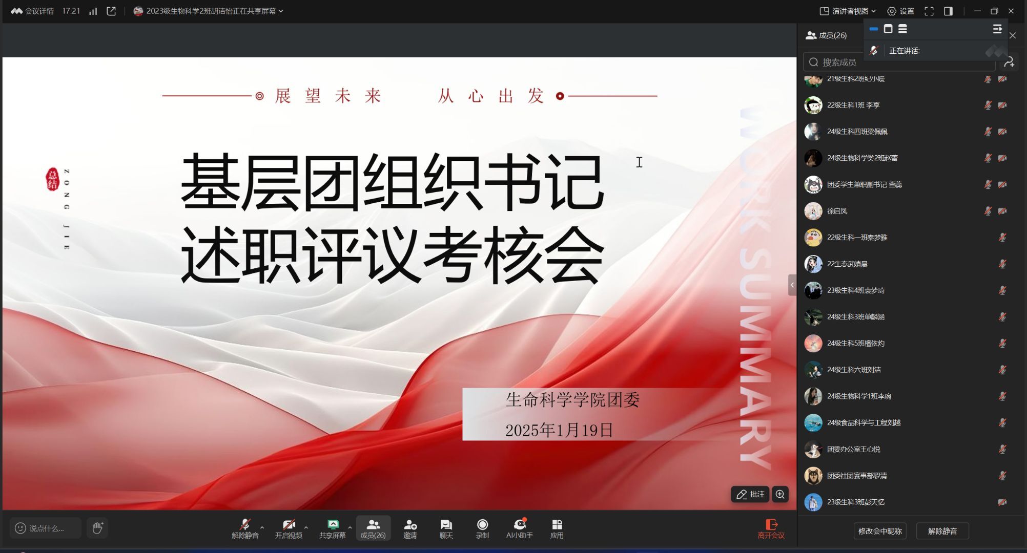 1月18日,生命科学公司在线上召开2024年度基层团组织书记述职评议考核会,对2023级各班团支部进行现场述职考核,进一步推动基层团组织的组织力、引领力、服务力和大局贡献度协同提升,各班团支书及团委负责人徐启凤参加会议。