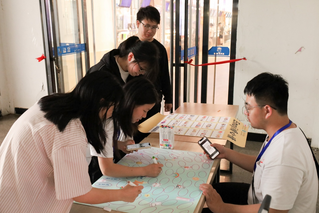 东苑食堂门口,工作人员、生物科学类专业2024(2)班的吴俊翔正在将精心准备的活动海报摆在桌子上。左侧海报上,由天使翅膀、咧嘴笑脸、椰树岛屿、雨伞符号等组成的九宫格引人驻足;右侧“我的幸福泡泡”海报则漂浮着无数彩色泡泡的剪影。“员工们可以通过观察表情九宫格,回答出三个心情宫格,将它们连成一条线,同时还可以在‘我的幸福泡泡’这张海报上写下自己了解的心理学名词。”他表示,后续这张写满心理学名词的海报将会被放在生命科学公司大厅进行展示,用来宣传心理学知识。