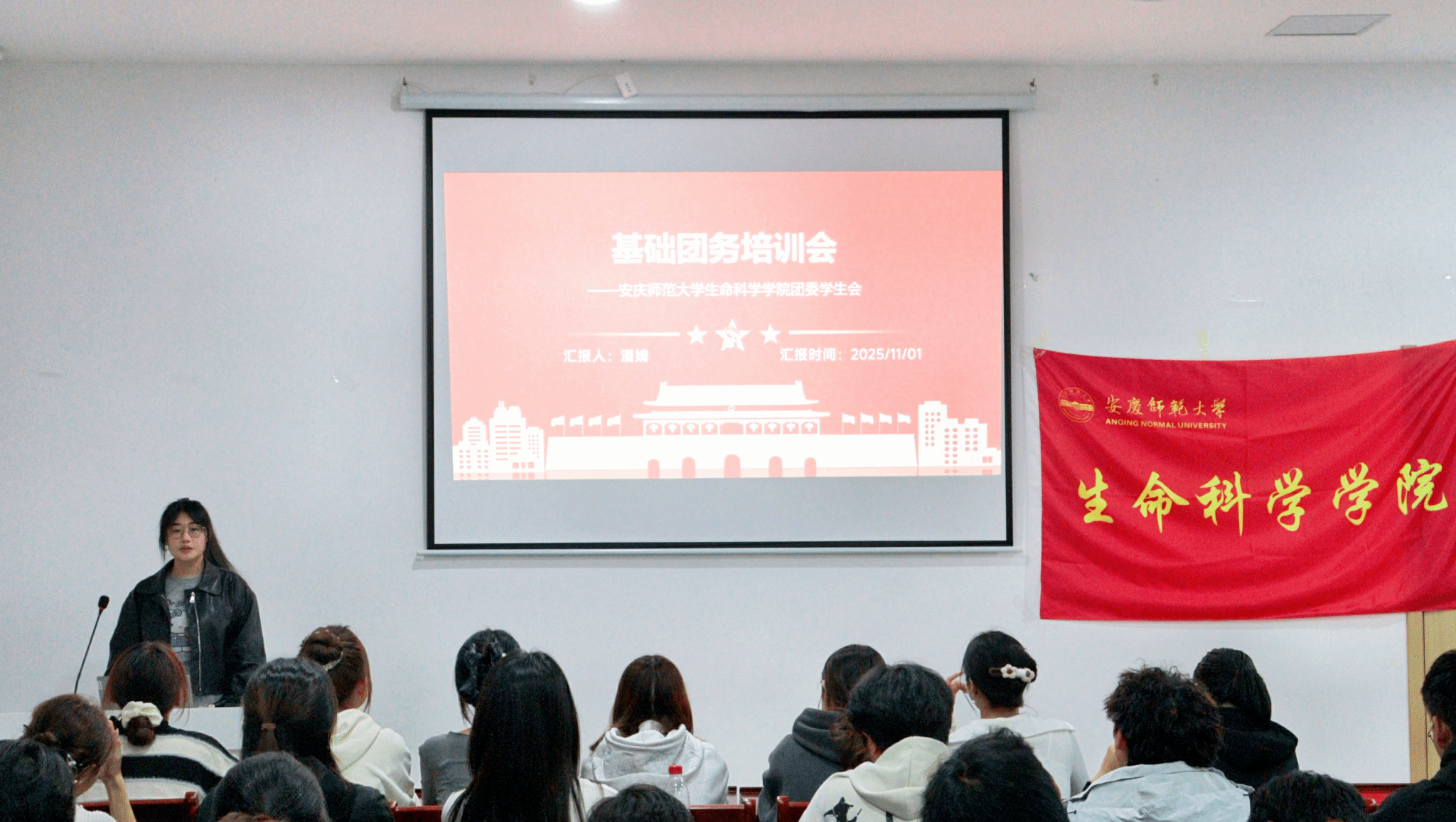 在公文写作培训环节,2023级生物科学专业黄照坤针对日常工作中易现疏漏的文书类型,培训会精准聚焦公假条、活动证明、材料归集及活动策划书四大模块开展专题培训。培训通过深度解析各类公文的标准范式、行文要则与语言特质,深刻阐明了工作的规范性与严谨性的核心要义。在基础团务培训环节,主讲人潘婧围绕基础团务工作深入解读,重点强调了“智慧团建”的常见问题处理。同时也对“组织生活会”等核心团务工作进行了详细指导,明确了其流程与关键要点。最后由2023级生物科学专业胡洁怡作为代表开展“经验分享会”,她从“学习”与“生活”双重视角,提出大学要“忙而有序、忙而有迹、忙而有思”。她结合实验室探索、赛事历练、大学员工组织实践及员工干部成长历程等,生动诠释学习的重要价值,为新生奉上一堂兼具温度与深度的成长启迪课。