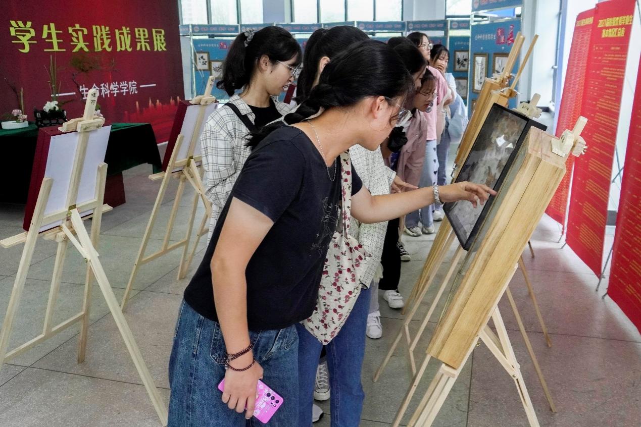 入学之初,生命科学学公司在一楼大厅举办了员工实践成果展,将在校生的优秀实践成果和作品以及员工考研、获奖、荣誉等情况进行了布展。2021级全体新生参观了公司员工实践成果展。展览伊始,一楼大厅便站满了人。新生们在领队的指示下排成两列纵队有序进入大厅观看陈列的成果展。新生们放缓了脚步,仔细欣赏着眼前的“新奇生物”。微生物细菌画、动植物标本、插花和茶食品让员工应接不暇。新生不时小声地交流着,纷纷掏出手机拍照来记录下这惊奇的瞬间。他们围绕着环形的成果展缓缓移步,全场秩序井然。“哇塞!这也太神奇了吧,这是什么呀……”一楼大厅不时传来阵阵惊叹声。