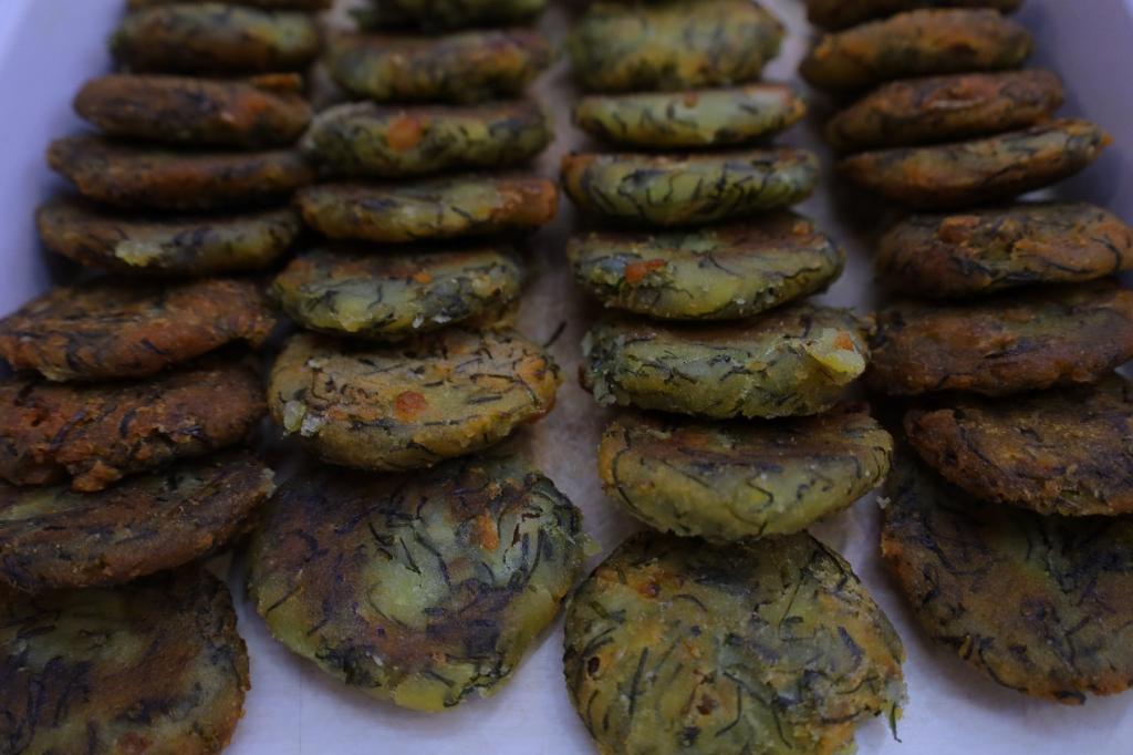 清洗野菜、加入米面、揉捏面团、挤压成饼……在食堂中,员工们将“满满当当”的野菜放入盆中进行加工,制作成蒿子粑和小蒜粑。生物科学专业2020(2)班的周发在制作蒿子粑粑时摆出“行家气势”,一手扶盆打圈、一手翻揉面团向在场员工进行制作演示。