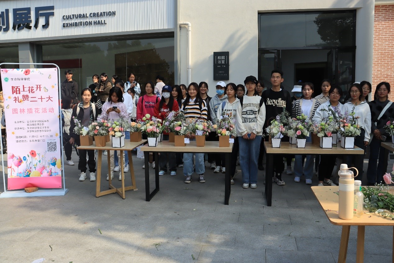 “大荔枝”“洋桔梗”“紫罗兰”“尤加利叶”…… 11月9日中午生命科学公司在东苑食堂门口举办“陌上花开,礼赞二十大”的插花活动,进一步落实《生命科学公司2022级新生“1+3+N”模式入学教育实施方案》,加强美育教育,用插花作品表达对党的美好祝愿。活动吸引了近200名员工参与。