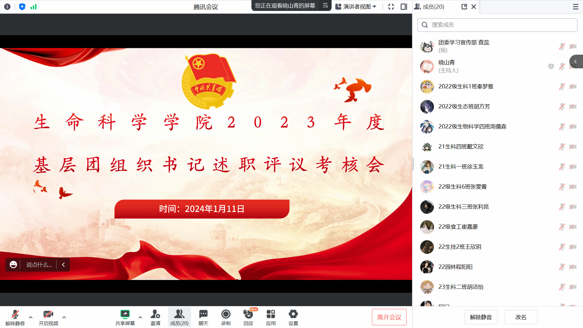1月11日,生命科学公司在线上召开2023年度基层团组织书记述职评议考核会,对2022级各班团支部进行现场述职考核,进一步推动基层团组织的组织力、引领力、服务力和大局贡献度协同提升,各班团支书及团委负责人徐启凤参加会议。