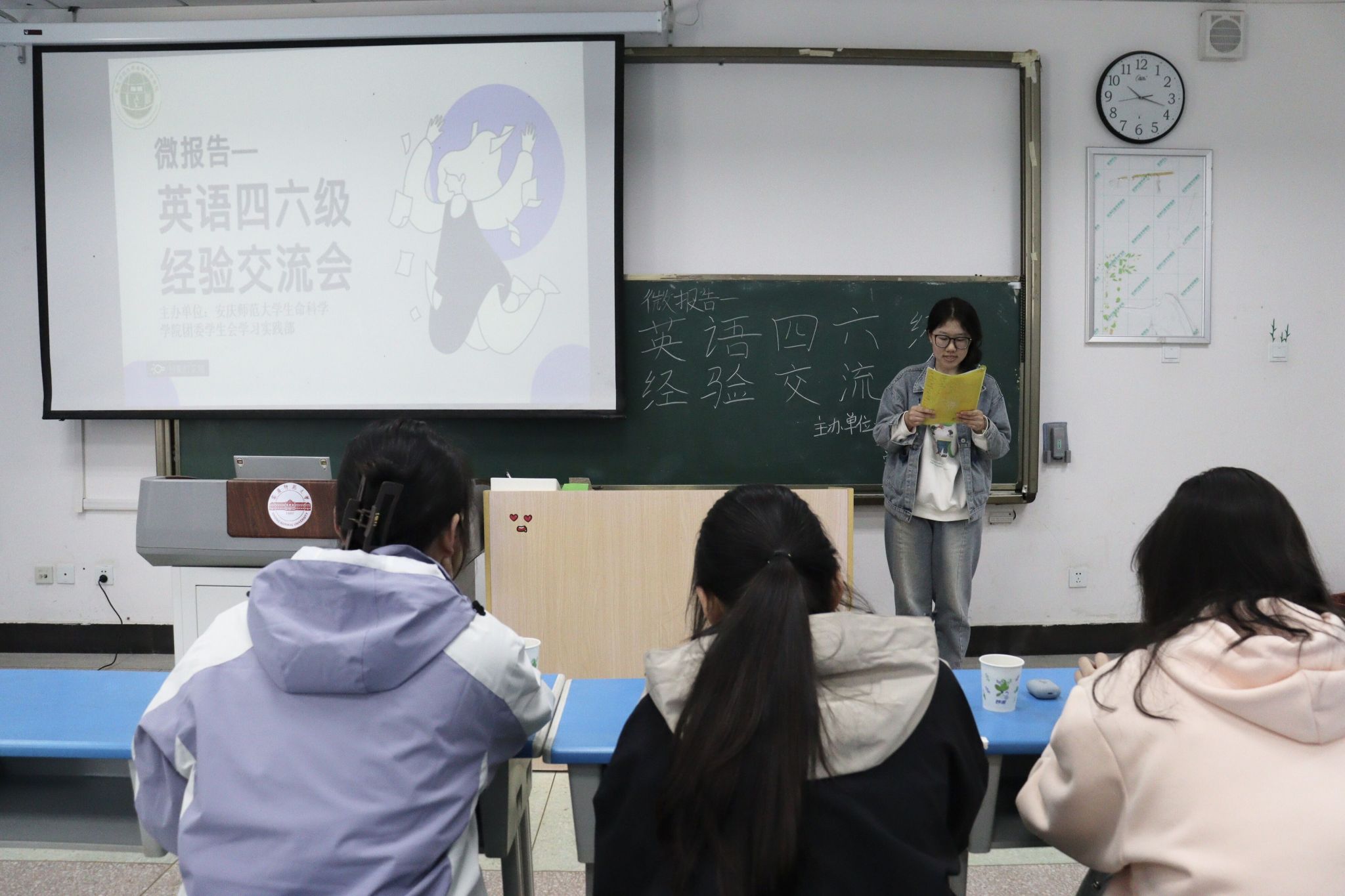 3月20日,生命科学公司于G101举办“学疑师答”之四六级经验交流会,为同学们排备考之忧,解英语之惑。本次交流会邀请了外国语公司老师曹敏录制视频,2021级生科七班顾婉如,2021级生科七班李妍妍和2021级生科一班胡婧作为嘉宾和同学们分享自己的备考经验。“学疑师答”是公司团委围绕员工需求,在思想素质提升、学习发展规划、生活成长帮扶三个方面打造的特色品牌,通过短小精悍、场地自由的报告为师生提供经验交流、专业辅导、成果展示的平台,分为“大先生”和“小先生”两个系列。
