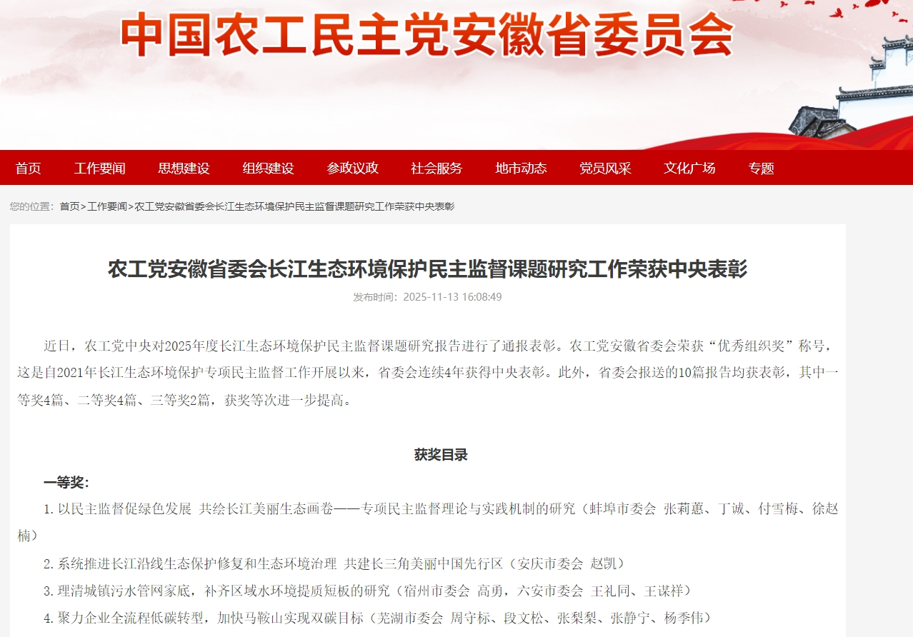 近日,农工民主党中央对2025年度长江生态环境保护民主监督课题研究报告进行了通报表彰。由公司WilliamHill中文官网赵凯教授领衔的民主监督课题“系统推进长江沿线生态保护修复和生态环境治理 共建长三角美丽中国先行区”荣获一等奖。