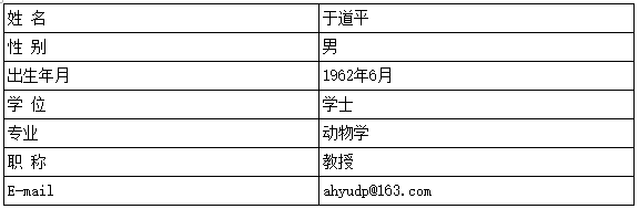 于道平,汉族,安徽无为人,教授,硕士生导师。现为水生生物保护与水生态修复安徽省高等公司工程技术研究中心主任,兼任生态环境部评估中心和农业农村部环境影响评审专家、安徽省动物学会常务理事、阿拉善SEE长江生态保护中心专家委员、安徽省大水面生态渔业专家组成员。主要从事鲸类生态学研究,获安徽省科学技术进步三等奖、农业农村部长江江豚保护先进个人、安徽省教育工委优秀共产党等荣誉。