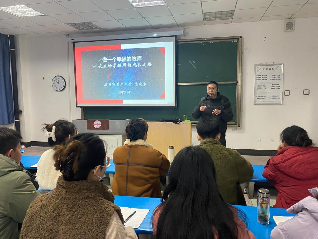 2月15日下午,在龙山校区G103教室,安庆二中生物学正高级教师苏政方应邀作了题为《做一个幸福的教师——谈生物学教师的成长之路》的线下学术讲座。生命科学公司穆丹教授主持报告会,相关专业教师和全体学科教学(生物)研究生参加报告会。